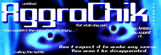 I did this for my AggroChik page when I first decided to make one. Ain't it cyber?? I then formed "Madam Aggie's Industrial Whorehouse," and the original AggroChik page was out of commission for a while. I didn't have anything of worth to put up there, anyway. But now that I am actually trying to learn more about graphics and html coding and all that cyber stuff (haha), and I have some cool stuff (what *I* consider cool, anyway) to put up here, I am doing an AggroChik page once again. If you thought my other pages were just a big wankfest, just you wait.... By the way, the text on this image isn't supposed to make sense to you unless you were in on these inside jokes. The only part you need to understand is this: "Don't expect it to make any sense. You won't be disappointed."