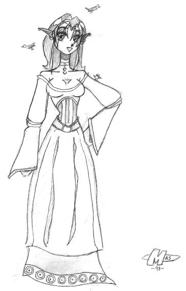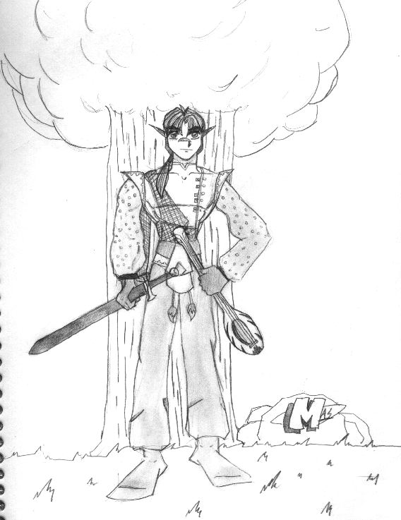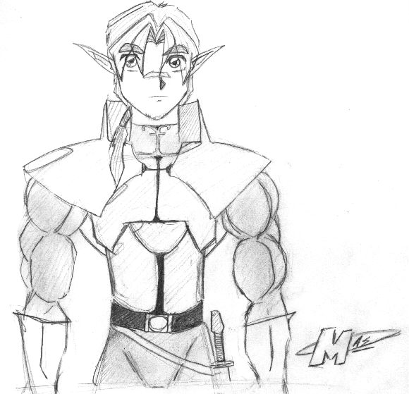 Description: Tall, handsome half-elf wiht silvery-white hair, usually drawn back into a pony-tail. Deep, mist grey eyes which can penetrate the darkest soul. Though his heritage is mainly elven, he has the muscle mass of a well trained human. Wears a suit of gleaming silver and grey chain mail underneath a set of golden hued platemail armor, left to him by his father. Carries twin silvered rapiers at his side, ready to meet any challege.