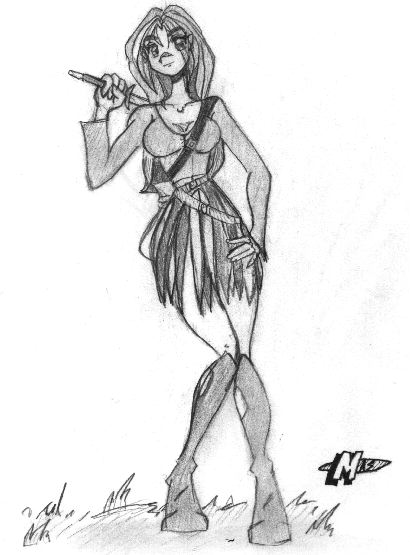 Descripition: 5'4", once long dark crimson hair to the middle of her back, now stained ebony bearing one illusive silver streak, veriegated emerald green eyes, fair complexion, and smile that can kill....and has. Wears a silver cloak over emerald battle-torn skirts and knee-high dark grey boots. Pay attention to her eyes...for they are the windows to her broken soul.