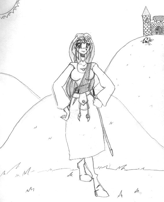 Description: A tall lass at 5'10, her curvy body proudly carries her clan's tatran. Her long skirt doesn't quite cover her bare feet, & the sleeves of her under chemise fall above her wrists. A force belt secures a sword, whip & dirk. A rune scribed band graces her left ring finger, a golden circlet rests on her brow, its amber/onyx stone centered on her forehead. A gold chain suspends a dime sized pink gem at her throat. Signet & black rings on her right hand. Dark auburn hair is wild around her delicate face, curling to mid-back. Wide eyes a shifting hazel, her voice gently soft. A tattoo on her ankle of a bow and arrow proclaims her an Avatar of Diana the huntress.