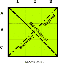 We call the diagonal that starts from the top left corner and ends at the bottom right corner, the main diagonal. On the other hand, we designate the diagonal that begins at the top right corner and ends at the bottom left corner, the secondary diagonal. Each square is identified with a row number and column number (e.g. A for the row and 1 for the column) that belongs to.