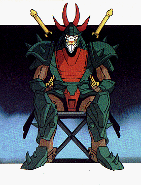 Naaza (Naza) The Poison Demon General ("Doku Ma Sho"), Naza has what can only be described as "bug eyes", and uses multiple swords as his weapons. His armor is green and red in color. He can control - perhaps through telekinisis - all of his six swords at the same time, while also projecting an image with six arms. He can also join all six swords together in what amounts to a razor-sharp whip. Naza is known as the Poison Demon General for good reason, as he has a full range of rather nasty poisons in his arsenal of weapons as well as his swords. After watching the Doku Ma Sho in action you get the distinct impression that Naaza is not quite sane. He seems to have a special hatred for Sh'ten - even when he's fighting Ryo, about half the time (when he's not telling Rekka how he's going to tear him apart) he's complaining about the Oni Demon General! While his armor is visually more insectile in appearance, it is the "Spitting Cobra yoroi", (and the symbol associated with his yoroi is a stylized cobra); and the poisons he uses in his attacks frequently cause prolonged suffering in his victims. He, or at least the yoroi, is said to be possessed by the spirit of the Asian snake god/demon, Naga. His not-quite human appearance may stem from myths in Japan of families who number snake-demons among their ancestors. These snake demons, like the kitsune (fox demons), could change into human shape and interbreed with humans if they wanted to. Families that had "snake blood" in their ancestory are said to often have scaly skin somewhere on their bodies, and their eyes sometimes are not human in appearance. If he used his power for good, the poison would heal instead of inflict pain and death. Birthdate - in 1551 ![]() |