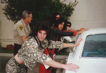 By Hieronymus Jacobin DDB Over 15 years ago, Tragic Hair Day disappeared during a flight from Los Angeles to Tokyo. Yesterday they came home - not to a throng of adoring fans, but to Johnny Law playing the role of fashion police. "I don't care who they are or what they did," LAPD Lieutenant Harold V. Dithers said, "Look at what those guys are wearing and tell me it isn't a crime." |