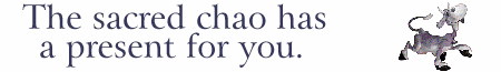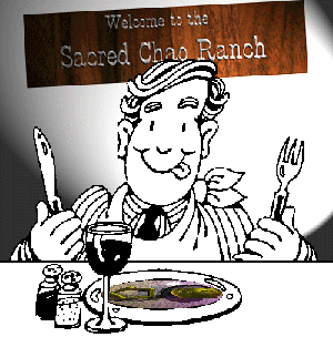 Welcome to the only True Discordian web page (Eris told me herself). If you are wearing a hat please remove it, there will be no hats at this site, unless of course you are not wearing a hat. In that case you should go get one so you can take it off and be respectful. Here at the Sacred Chao Ranch you will find no cowboys, barns, or Scientologists. |