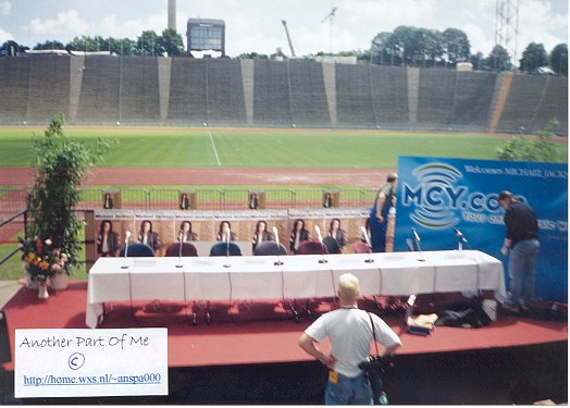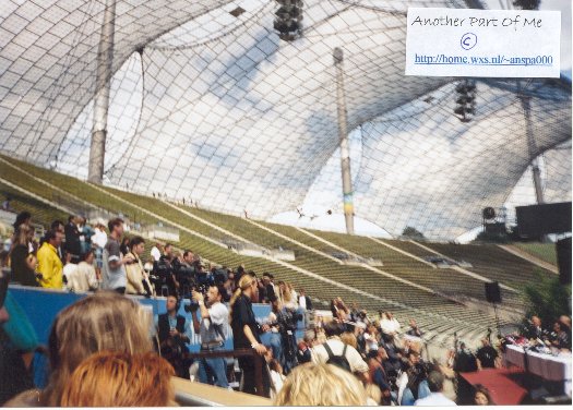 "thief" and ripped of some promoposters from the noticeboard in the street! I was so happy I got one!! lolWe didn't know what entrance to take, but after a while we saw reporters from ANTENNE, a German radiostation, arriving and we followed them into the stadium, like we were part of that team, LOL!! All of a sudden I felt "an acute attack of acting talents" coming up........The lady behind the desk of the Press Room asked if we were press members and I said yes, and that we were reporters from an MJ website. She asked for our businesscards, then asked us to sign in on the press-list and gave us some press info-material (cool, a complete infobook about all the artists that will perform on the concert!) and, most important, synthetic bracelets to show security we were press members! LOL!!