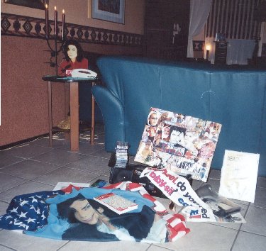 THERE WAS MICHAEL!!!! What an excitement, we screamed "Michael we love you!!!!" and he blew handkisses to us, waved, made his famous "I love you all" gesture with his arm and then disappeared in his room. I just couldn't believe he was really there! It is almost impossible to describe the feeling that it gave me to see him back after a long time. The last time was the Oostende Diana concert in Belgium in 1997!Michael returned at the window so many times that evening, he was really there for us! He showed us a white pillow at the window, he wrote
