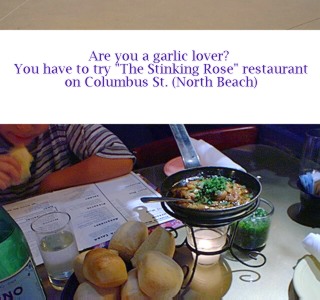 Our 2nd day ended with dinner at an interesting place called "The Stinking Rose" --a restaurant for garlic lovers! Literally our appetizer had at least 30 cloves of garlic sauteed in olive oil! Yummm! Day 3 pictures click here