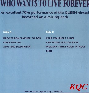 An Excellent 70`er performance of the Queen himself recorded on a mixing-desk. Original Sheetkeeckers bootleg, recorded at The Rainbow Theatre in London on 31 March 1974. Side A: 1.Procession/Father To Son 2.Ogre Battle - 3.Son And Daughter Side B: 1.Keep Yourself Alive 2.The Seven Seas Of Rhye 3.Modern Times Rock`n Roll 4.Liar |