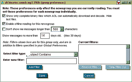 4. After adding the groups, click on the read my newsgroups button, and click the newsgroup you want to read, when the window opens click on the preferences button at the bottom of it, and a new window will open.Be sure to check the box that says "show only complete binary files which AOL can automatically download and decode". Save this setting.