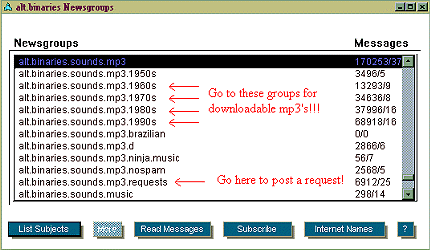 I decided to put this up because of people asking me how I use the newsgroups to get mp3s... Hope this helps you out.