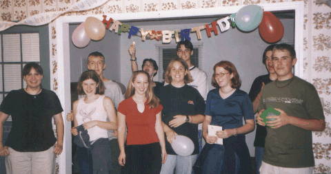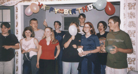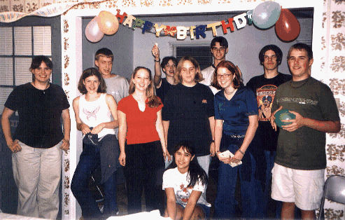 From left to right -- Mandy, Laura, Adam, Kelly, Ashley (in the back with the lighter - kind of scary don't you think?), Ashes (in the front middle with the balloon), Ivan (the tall guy in the back), Beth, Brooks, and Jonathan. |