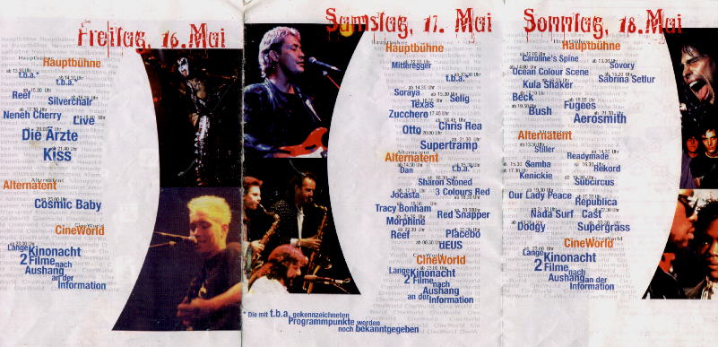 verspricht für alle musikalischen Wünsche das entsprechende Angebot. Die Zusammenstellung von Rock im Park symbolisiert das außerordentliche Musikinteresse der Festivalfans und ihr spezifisches Lebensgefühl, das sich in diesem Ereignis der Pipkultut spieglet. Die Vielschichtigkeit unterschiedlicher musikalischer Strömungen findet ihren Ausdruck in drei zentralen Schauplätzen , der Hauptbühne, dem Alternatent und der Dance-Hall. Auf der Hauptbühne (Center Stage) agieren mit Kiss, Aerosmith, den Ärzten, Fugees, Supertramp, Bush, Kula Shaker und 20 weiteren Acts die Superstars der Rockszene. |