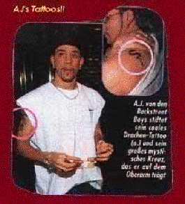 Don't you just love AJ's tatoos? He keeps getting more...I can't keep up! What the official count now? I didn't know Brian had a tatoo! I think it's on his left arm & it's of a cross. I think it's cool that AJ is constantly changing his hair, but I'm wondering...after so many chemical processes...won't it get messed up and fall out? I prefer him with the goatee than without, too. I like Howie's new semi-goatee. It's fly with the slicked back ponytail do. Have you noticed that Brian hasn't been really fixing his hair for appearances? It's kinda just combed forward. I noticed in older videos that it was more neatly cut. What's up with that, Brian? Now...Nick's hair...please keep it kinda short & slicked back. Did you see his hair in "A Night Out..."? It looked funny that long. Last but not least, Kev...I didn't like it in "Quit Playing Games", but lately, it's been looking good...after all he's model material!