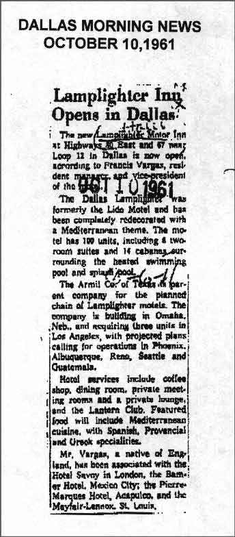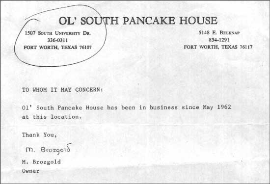 In his confession, James Files said he stayed at the Lamplighter in Mesquite, Texas and that he took Johnny Rosselli to a pancake house bythe corner of the Interstate onUniversity in Fort Worth, Texas. There is no way Files could have known about these two places if he had not of been there in 1963 and most importantly they would both have to have been there in 1963.We believe the documents below speak for themselves.