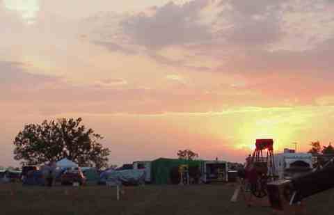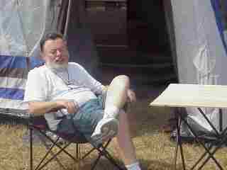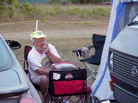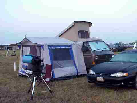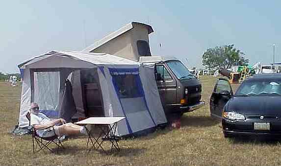We set up camp at the Kansas Astronomy Village, site of the annual event. This was our first opportunity to try the new Komet side tent on the Westy. It added a lot of living space. Below: Dave soaks up some rays in front of the tent.