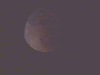 Totality - 2215 Hours Note the definite red tinge to the barely discernable disc of the moon. The moon is still lit by sunlight refracted through the earth's atmosphere. Since the atmosphere scatters blue light, that leaves the low frequency red/orange light to strike the moon, giving it its red appearance. |