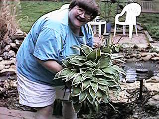 Jean prepares to install a Hosta crispula. This is a plant that thrives in our shady back yard.