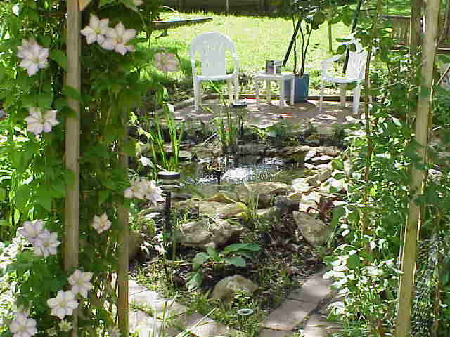 A Solitary Clematis blooms on the south side of the arbor sheltering the path to the water garden and beyond to Jean's "thinking spot.". A beautiful climbing red rose adorns the north side.