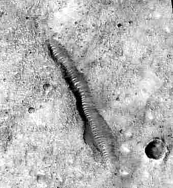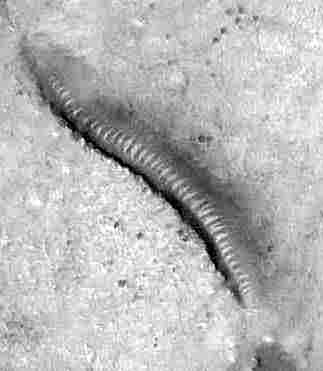 These curious images were taken by the Mars Global Surveyor. What do the rib-like structures represent? It's anyone's guess! Possibly the fossilized remains of a mile-long worm. So, what does a mile-long worm eat? Anything it wants, I guess! You may view the original NASA image at the following link: (warning -- it's a 10 Mbyte file.) http://www.msss.com/moc_gallery/ab1_m04/jpegmaps/M0300102.jpg