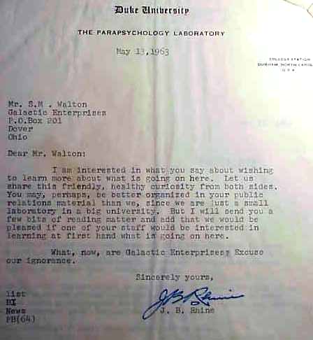 I was thinking over the notion that Mother Nature can be a cruel mistress. You know, it's a eat-or-be-eaten world out there. So what makes us think that it's any different on far away worlds where evolution may have taken another path? Check out my developing short story. We Come in Fear My interest in science fiction developed at an early age, largely thanks to some fascinating tv shows. | Someday soon, if I can accumulate enough artifacts related to this endeavor, I shall create a chronical of this futuristic and visionary undertaking. It all started when Mike read a short story by Robert A. Heinlein entitled "We Also Walk Dogs." "Why can't we start a company like that?" he asked. One of our start-ups was called "Talents, Unlimited," wherein we hoped to assemble a cadre of psychics to rent out to businesses and interested parties. We even corresponded with J. B. Rhine at the Duke Parapsychology Institute (see below). And the rest is history! | ||||||||||||||||||