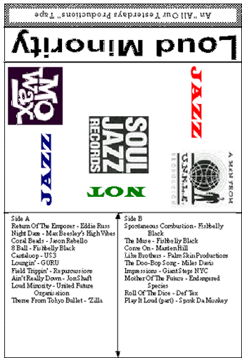 Loud Minority - Early 90s Jazz not Jazz e.g. Fishbelly Black, United Future Organisation, Palm Skin Productions - email me for full details or look at the tape sleeve for tracks