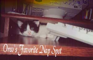 like to sleep beside Stacey on her waterbed -- but I do NOT like it when she rolls over, because the whole bed rolls with her (waterbeds tend to do that). My favorite spots in the house are in front of the sliding glass door, where I ocassionaly touch the screen...and am tempted to climb up the screen...which Stacey and her mom don't like for some reason, beside Stacey at her computer, or under the rocking chair stool, which I sometimes bite, just because I want to. I like to play with my "baby," a kitty beanie baby from McDonald's. I carry her around with me and attack her occassionaly, when the mood strikes me, and I feel she has been looking at me funny. Stacey and her mother can't figure out my facsination with sleeping in the bathroom sink. What they don't know is that I'm a little girl, and the sink is a little sink, so I fit right in there. It's just my size. It's my favorite bed, since I outgrew my previous napping spot, on the sliding keyboard tray on the computer desk. My latest toy is the best. It's a stick with feathers attached to the end. I run and jump to chase the feathers as Stacey, Drew, or Mom wiggle the stick. Sometimes, I chase so hard I pant like a puppy, only I look cuter than a puppy, cuz, well they smell.