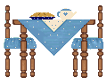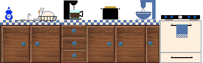 Hiya. It's me, Tyler again. Smokie said you guys worked up quite a sweat in the backyard. Well, I have some ice water for ya, if you want. This is our kitchen. We've decorated it with kitties in cups. The wallpaper and some graphics came from CatStuff, a GREAT place on the web to get kitty graphics. They have well over 3,000 kitty graphics. The majority of the graphics came from Viki Mouse Graphics. Both links are below if you'd like to stop by and visit them there. We like to enjoy our breakfasts and lunches here, but our diners are eaten in the dinning room, which you'll see later on in the tour. For now, lets go see what Oreo is doing in the play room! She's ALWAYS playing! Go On To The Playroom!