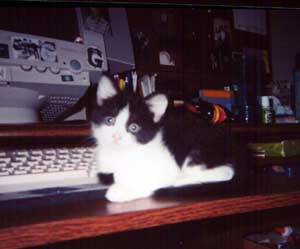 Hello! My name is Oreo. I'm Icyblue's kitten. I'm a little girl, and I'm between 9 and 10 months old, which makes me a Gemini (we think), and I weigh a whopping 6.6 pounds; yes, I'm still a little tyke. I have black and white fur, which gave me my name. My face is black with a white strip up the middle, just like Oreo Cookies! I have big hazel eyes that grow round only when I'm planning on getting into some trouble. All in all, I'm a pretty adorable kitty, says my owner, Stacey. In fact, she says I'm a very pretty little girl...when she's not calling me "No, no."