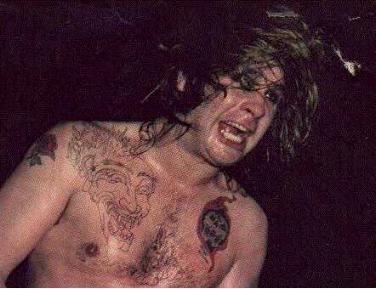 Picture of Ozzy headbanging. You'll notice... all of his tatoos aren't completed yet.