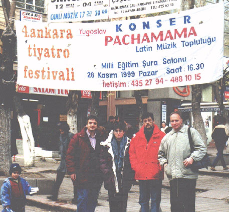 The IV International Theatre Festival held in Ankara (November 18th - 28th 1999), and organized by VACIF Foundation, was the opportunity to assist to the performances of numerous theatre groups from Turkey, France, Holland and Azerbaijan. During the final evening, the organizers awarded all the participants with special diplomas. The public had the opportunity to listen to the turkish folk music performed by group Anatolia (click here) and to the music of the Andes performed by ensemble Pachamama (click here). |