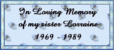 It was father's day weekend, that Sunday Lorraine and me spent the whole day watching movies. On Monday June 19, 1989 I last saw my sister at the dinner table, we always ate dinner as a family and shared our days. That night her and some friends were going shopping. She left after dinner. My dad took me to my guitar lessons at 6:30 and then picked me up at 7pm so I could practice driving, as my test was the next day. I was driving my dad around and we came to an intersection but it was partly blocked off. I jokingly said, "we should check it out" to which my dad said, "it has nothing to do with us" Little did we know that it did. A few minutes after we got home the phone ranged and I answered it. It was the hospital, they wanted my dad, and he had some test done days before, so I thought that's what it's about. I called him and he got the phone. I have never done this but for something told me to stay on the phone. I did. All I remember was them saying that there had been an accident and: Lorraine was involved, well the next I know I'm in the basement telling my mom, I don't remember walking down the stairs, I must have ran fast. They went to the hospital. I stayed home, so I could tell my brother that Lorraine was in an accident and in the hospital. Which I did and was like yeah so what, she'll be home soon. I remember my dad calling to say that they were sending someone over to sit with us and when I asked about Lorraine, he just said it doesn't look to good. When they got home they sat my brother and I down and told us that Lorraine had been killed in a car accident. Right then and there I felt my heartbreak and this pain came over me. That was the hardest thing I have ever heard. My heart was ripping in a million pieces. I don't remember much that night. I do remember that it hadn't rain much and it just poured down that night right as my parents were going to the hospital. My mom always said it was the angels weeping that day. I remember at some point that night the cops showed up and so did the parents of the other girl (my sister's best friend) that was killed with her. We found out that it was a drunk driver who hit them. All I know is that I was very sad and angry because I couldn't remember what she looked like, it was upsetting to me, and now looking back I was in shock. I went to sleep that night with her picture in my hand.
