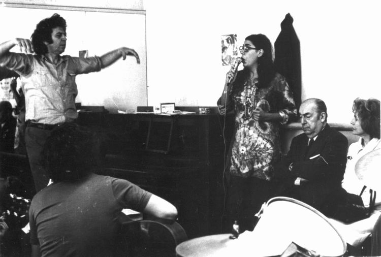 Mikis Theodorakis and Maria Farantouri rehearsing "Canto General" with Pablo Neruda present.