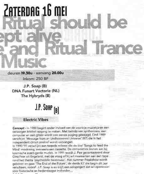 DURING THE YEARS JEEPEES SOAP ALSO PLAYED SOME GIGS. MOST OF THEM AT SMALL LOCAL CLUBS LIKE PUBS AND SOME YOUTH-CLUBS LIKE THE FORMER O.J.C.CLICHEE WITCH IS NOW KNOWN AS ' T KOMPAS AT SINT-NIKLAAS. I WAS ALSO LUCKY TO APPEAR AT A GREAT EVENT OF INTERNATIONAL ART AND MUSIC THAT TOOK PLACE AT SINT-BAAFSABDIJ IN GHENT BETWEEN 2-31 OF MAY 1992 AND WAS CALLED "BRUL" WHAT MEANS "SCREAM". SINT-BAAFSABDIJ IS AN OLD MONK CASTLE WITH AN ANCIENT HISTORY.