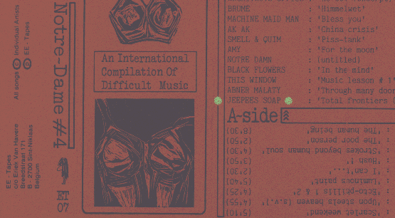 ONE OF THE LEADING PRODUCERS OF SUCH MUSIC IS AND WAS SOMEONE WHO LIVES HERE IN SINT-NIKLAAS. HIS TRUE NAME IS ERIEK VAN HAVERE BUT HE IS MUCH BETTER KNOWN AS LITTLE ERIEK. WAY BACK IN THE EARLY 80'S ERIEK STARTED PRODUCING THOSE SO CALLED UNDERGROUND GROUPS ON HIS OWN LABEL WITCH HE CALLED ET - EE TAPES . .ERIEK PUT ON THESE TAPES A WIDE RANGE OF INTERNATIONAL ARTISTS FROM OVER THE WORLD, HE CALLED HIS COMPILATION THAT IS STILL GOING ON - NOTRE-DAME - ON THESE COMPILATIONS HE COLLECTS AN INTERNATIONAL DIFFICULT RANGE OF MUSIC. JEEPEES SOAP ALSO APPEARED ON THIS COLLECTION.