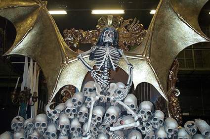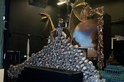 "Da sieht man einen sogenannten Totenhügel zum Beispiel, das ist in einer Szene, wo der Rudolph gestorben ist, das ist ne ziemlich grosse Kulisse, wo ganz viele kleine Totenschädel aufgestapelt wurden und die dann gleichzeitig in den Augen noch ein bisschen Funkeln können, das sieht ganz witzig aus, wir haben das grosse Rudolphshaus, was fast ne Tonne wiegt und wirklich manuell und mit Schwertführung reingeschoben werden muss, diverse andere Sachen, die auch hineinfahren, so wie die Feile, immer wieder ein Highlight, wenn die hydraulisch betriebene Feile von der Seite aus dem Nichts auftaucht, schön beleuchtet, hydraulisch reinfährt ganz leise und den Tod dann immer zum rechten Zeitpunkt von der Bühne bringt."