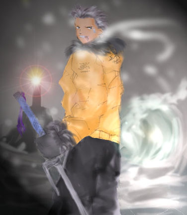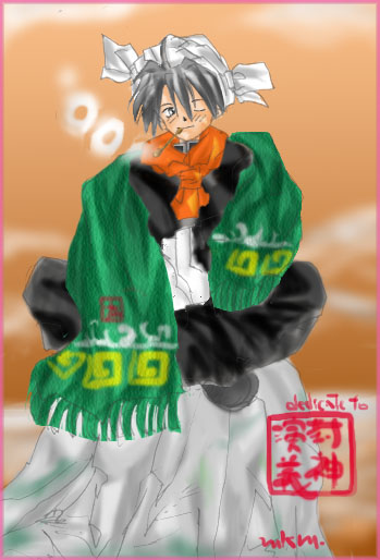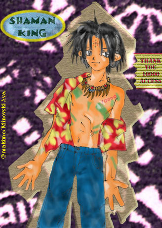 同じく旧表紙から、ジャンプコミックスの「シャーマンキング」より麻倉葉。これもワンピと並んではまりましたっす。脱ぎかけてんのはボディペイントを描くのが目的で、他意はないぞ。バックの文様の方が手間取りました。一万ヒット記念。
