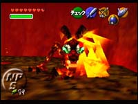 Go up the stairs, hang a left, and enter the door. Short story sequence here. Now start hopping stones and make your way to the left of this chamber. There's a cage there with a Goron in it. Step on the switch to release him and nab the small key in the treasure box behind him. Now hop on back to the door you came in and exit this chamber. Walk straight across to the door on the other side and enter it. Now in this large chamber make use of the bridge and platforms to make your way to the left side of the chamber. There is a small hallway and a door there. Don't panic if you fall in the lava, your new tunic keeps you from getting hurt at all for a few seconds to give you time to get back up. Anyway, go through this hall and door, and down the next hall to another Goron. Free him and get the key from his treasure box. Now go back to the big chamber and hop your way across to the other side (the right side). Blow open the wall to find another Goron and key. Now finally make your way to the other end of the chamber from where you came in to where there's a locked door. Go through and you're at the Fire Elevator.In this interesting room, slide down the ramp and then climb up the fence. Climb up to the top of the fence and kill the two bats there, then drop down to the platform just below you and push the movable block off of the edge. Then fall down and land on the moveable block and you'll be shot up into the next room. Go through the locked door here into the green room. Climb up the ledges and kill the little torch slugs. Jump across to where you see a white diamond thing and a movable block. Push the movable block off the side, then drop down and pull it until it stops. Climb up onto it, hop over to on top of the Goron's cage, and climb up the fence. Now walk forward all the way until you hit the wall, and stand on about the forth tile from the cliff edge. Get out a bomb and throw it towards the edge. It will drop down and set off that diamond thing (it's a switch) which will make the pillar of fire temporarily disappear. Climb up the fence where the pillar of fire was and go through the door that's up there.Now you're in the big boulder room. Turn right and keep going that way, dodging boulders, until you find another caged Goron. Get his key. Now as you exit his cage follow the left wall past a locked door (don't go through it) until you reach the other side of the room and the second caged Goron of this room (he's through a door that's in an alcove that may be hard to see). Now on the way out of this room hug the right wall until you find that locked door and go through it. Here you'll have to carefully walk across a walkway. If you look high above the blocked door you'll see a gray eye tile. Shoot it with an arrow to unblock the door. Through the door is the Dungeon Map. Back in the narrow walkway room, go through the locked door. In this next room walk along the stone path and jump over onto the fence. A flame will follow you. Just hurry forward hopping over to the next fence until you reach the unlocked door on the other side. Go through it.Now you're on the upper level of the big boulder room. Hop onto the platform in front of you and kill the torch slug, then use a bomb on the crack in the floor and climb down. Down here you can rescue the Goron from the green room and get another key, not to mention an easier way up later in case you fall down somewhere. Now climb back up and hop a few ledges to get to the switch that's near you. This switch will free a Goron on the other side of the big boulder room. Hop ledges and make you way over to him and get his key. Now that you've got 2 more keys hop your way back to the door you came in. Look high up and to the left when facing the door and you should see a high ledge. There is a secret area up there. Go through this area and you'll pop out in a donut-shaped room where the Megaton Hammer is. Step on the switch and hurry to the treasure chest (use your hookshot to get past the steep cliff). Open it to get 200 rupees. Go back down and go through the door back into the fence room.This time, back in the fence room, jump your way across to the locked door. The last jump to get there seems impossible but it's not. Just jump slantwise from the corner of the fence to the corner of the ledge and if you keep holding forward you'll grab on to the ledge and pull yourself up. Go through the locked door. Follow the short corridor after it and you'll find yourself in the giant fire maze chamber. Hop on down and head to the right. You'll have to dodge spinning flame throwers, rolling boulders, and proximity sensitive flame walls to make your way to a door in the far right wall. The compass is through that door. Be wary of fake doors in here. They'll hurt you if you try to open them. If you're unsure put a bomb next to it to find out if it's fake or not. Now head back to the starting point and then to the left side. Make your way through this maze to the locked door on the pillar in the middle of the chamber. Go through it and you'll see a trapped Goron on your right. You can't save him yet. Instead continue on and go out the door on the other side.Now you're back on the right side of the maze. Make your way toward the right wall of the chamber where there's a yellow switch. If you step on it the big fire wall on the opposite side of the room will disappear for a few seconds. Hurry (I know it's hard to hurry in this maze, but you'll have to) through to where the fire wall was and run past it before the time runs out. The door ahead is a fake. That said, blow up the door with a bomb and then go on in through the real door and face the first dancing fire-man mini-boss. This mini-boss is really easy if you have bombs...otherwise he's a lot harder, but I recently found out still possible to beat. All you have to do is throw a bomb at him. When it explodes he'll shrink to a little helpless black ball. Slash him a couple of times and he'll run away. Don't ch