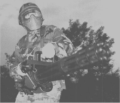 This is the M134 7.62mm Minigun , the guy in "Predator" carried.When I first saw it I got so happy I jumped off the window.This thingy needs three heavy duty 12V truck batteries or alternately a 28V 115Amp power cable in order to be powered.Of course the carrier wears also a "backpack" full of ammo.You see , it shoots about 6000 Rounds Per Minute(RPM).