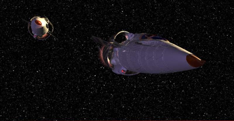 smaller Federation ship drops out of Transwarp, making a left turn to join