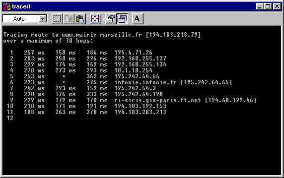 Voici une autre commande, autrement astucieuse. Vous savez que les messages émis sur le Net rebondissent d'un serveur à l'autre jusqu'à ce qu'ils arrivent à destination. Nul ne peut prévoir le chemin qu'ils emprunteront. Vous pouvez suivre un appel à la trace (on dit tracer un appel) avec la commande Windows Trace Route, appelée TRACERT. Elle semble absente de l'aide Windows.