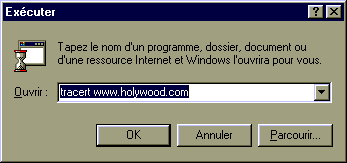 Dans ce cas, cliquez sur le bouton Démarrer, puis sur la ligne Exécuter et tapez la commande TRACERT suivie par une adresse Web quelconque, par exemple : www.hollywood.com pour vous rendre en Californie. La ligne de commande pourrait être :