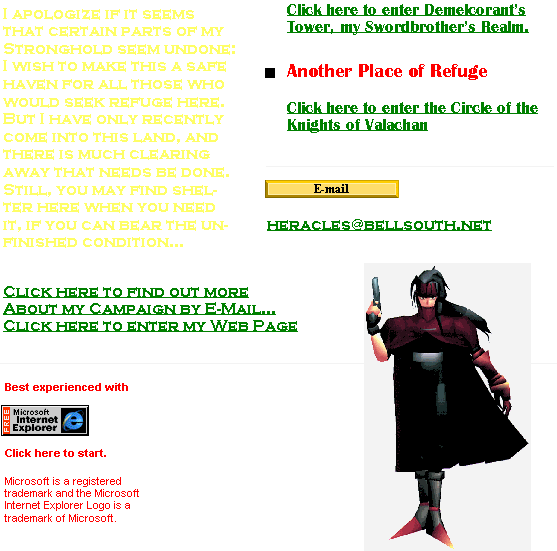 I am currently thinking about bringing a campaign by e-mail to you. It would be different from the way other campaigns are done: to be quite frank, its going to be an experiment. The characters are going to be pre-generated and made up by me for the most part. Each will come with an attached storyline and people will be free to "audition" for the characters as if they were parts in a play.