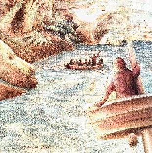 Certa manhã partiu com os seus homens para a caça, como habitualmente. Dirigiu-se para a foz de um ribeiro, na esperança de aí encontrar algum veado a matar a sede. Mas o que viu deixou-o espantado: no ponto onde as águas do mar e do rio se encontravam estava uma linda mulher marinha, de cabelos soltos e mal coberta por um vestido de algas. Dormia tranquilamente, gozando o sossego da manhã, com a cabeça apoiada nas plantas da margem.