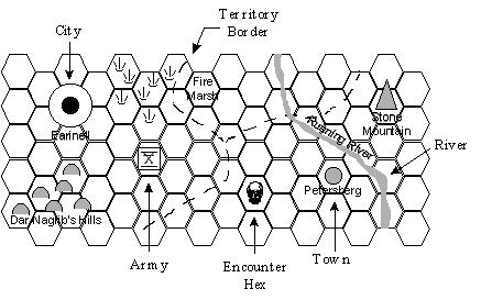 The next step is to use this story to design a map. Maps should be drawn on a hex map (the counters included are designed for a 1" hex map). You can buy very large hex sheets - 3 feet x 4 feet -from game stores, hobby stores, or Rider On-line (see our section on stores elsewhere on the web site). Draw in swamps, mountains, hills, or other terrain features you might think are appropriate. Next, break the map into territories - territories represent small areas of land, usually centered around a settlement. The importance of territories will be explained later, but they should be approximately 10-25 hexes in size. It doesn't matter if the lines drawing the territories are crooked or straight. Again, make a map of a pretend kingdom, or whatever, with its little fiefdoms, trade centers, etc. Then add any towns, cities, villages, or fortresses, no more than one per territory. (Remember that these items all have their own points cost, which will need to be taken into account when determining army sizes. If you plan on playing a smaller campaign, too many villages and towns will quickly eat up your points allocation!)