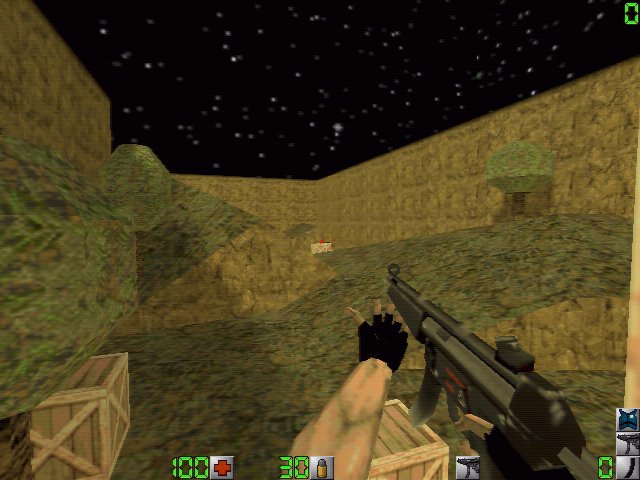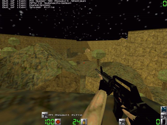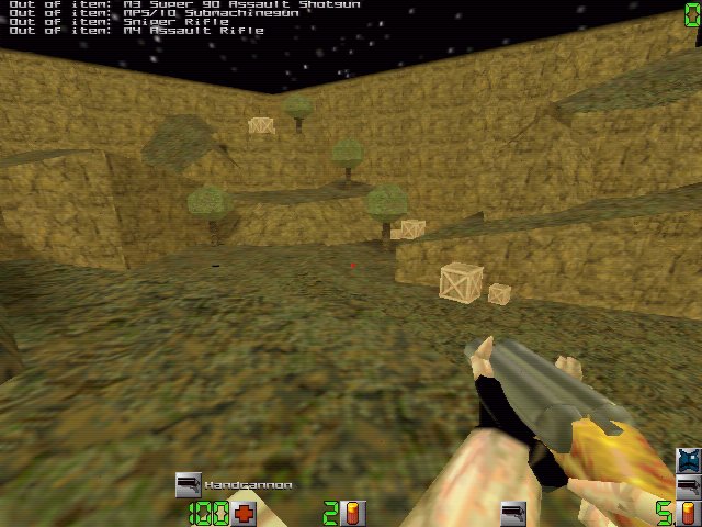 The M4 assault rifle ---------------- This is a special issue M4, basically a scaled down version of the M16. As you would expect it is accurate and deadly. The rounds are also penetrating so they actually pass through the victim and can hit people behind him. It carries 24 rounds per clip but only one extra clip may be carried at a time. Use 'weapon' to switch to 3 round burst mode and increase accuracy. The hand cannon ---------------- Word to the wise; don't get in front of this thing. Basically a sawed off double-barrel shotgun it's spread is wide enough to kill just about anyone getting too close. However, this benefit causes the gun to become nearly useless at long and medium range. It uses the same ammo as the shotgun but only holds two shells at a time. This weapon is unique. The granades ---------------- If you see an M26 Frag Grenade thrown you had better take cover fast. Even if it doesn't kill you it is liable to blow you out a window or break your legs. Of course the one who threw it is just as susceptible to it's effects, and impatient handling of these has led to more than one player blasting himself. You can only carry 2 at a time, so use them wisely. Duck to reduce damage by this sucker by half. Use 'weapon' to increase your throwing range...