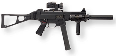 Disassembly of the UMP is easy. The weapon fieldstrips into three basic assembly groups with the removal of a single locking pin, making cleaning and maintenance fast and simple. No other submachine gun in the world offers the speed and simplicity of the unique HK Quick Connect sound suppressor attachment interface found on the muzzle of the UMP. The sound suppressor can be installed and removed easily in seconds. For tactical team use as the ultimate CQB weapon, for issue as a squad car carbine, for a pistol caliber companion weapon to HKs new .223 G36 rifle or carbine, or as a pistol caliber long gun to supplement HK .45 or .40 caliber handgunsthe UMP is the worlds most advanced submachine gun for the uncompromising user. For the new millennium, the UMP reigns supreme. |