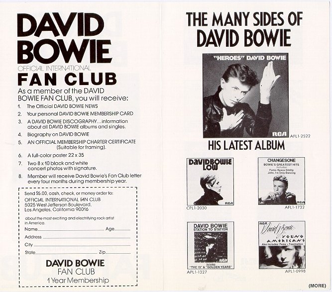 As promised: One scanned copy of a 1977 advertisement for the International David Bowie Fan Club. No fair, I want a 22 X 35 poster, two 8 X 10 concert photos with signature and an OFFICIAL MEMBERSHIP CHARTER CERTIFICATE (suitable for framing)!