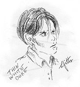 Maximize | Minimize | Question | Restore Down | Restore Up - - - Well, it took forever, but I've finally finished my handwriting analysis of Bowie with the help of Sik Ling Ling's Free Handwriting Analysis Page. What does Bowie's big loopy handwriting say about his personality? Click here to find out! [Added 08/02/00] Coming Soon: After four weeks, my watercolor of Berlin-era Bowie, in the style of a cathedral window, is finally finished, photographed, and ready to be scanned... when I find a scanner, that is. Yes, I realize there has been an abundance of Bowie-art ("art") up here lately; I promise it's just a phase, and I *will* go back to making real art very soon. However, if a good rendering of David's cheekbones makes you tingle, here are a few diamonds-in-the-rough I discovered while cruising Teenage Wildlife's collection of smelly-bad-fan-art:
