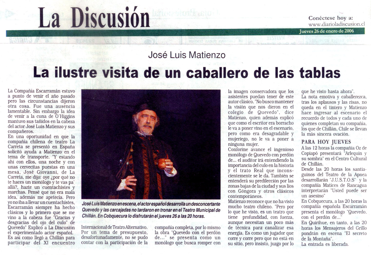 tablas José Luís Matienzo en escena, el actor español desarrolla un desconcertante Quevedo y las carcajadas no tardaron en tronar en el Teatro Municipal de Chillán. En Cobquecura lo disfrutarán el jueves 26 a las 20 horas |