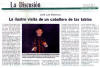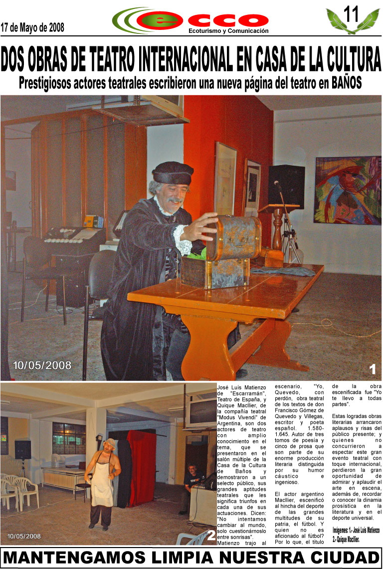 José Luis Matienzo de "Escarramán", Teatro de España, y Quique Maillier, de la compañía teatral "Modus vivendi" de Argentina, son dos actores de teatro con amplio conocimiento en el tema, que se presentaron en el salón múltiple de la Casa de la cultura de Baños y demostraron a un selecto público, sus grandes aptitudes teatrales que les significa triunfos en cada una de sus actuaciones. Dicen: "No intentamos cambiar el mundo, solo cuestionárnoslo entre sonrisas".